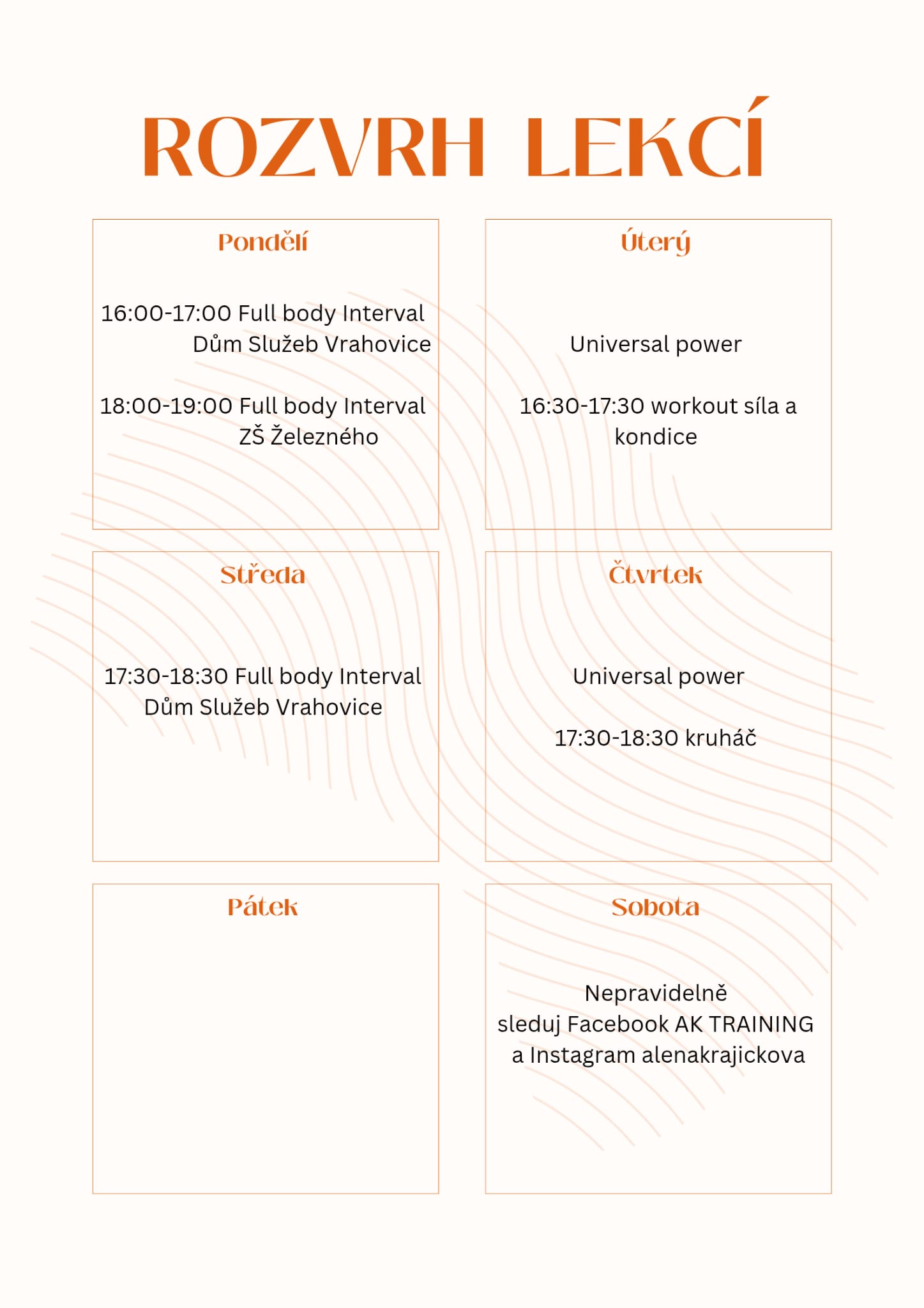 Trénink je sestaven tak, aby dával smysl – bez zbytečné divočiny, ale s pořádnou dávkou efektivity. Ať už chceš zesílit, zrychlit, zpevnit nebo jen vyčistit hlavu, tady si přijdeš na své.